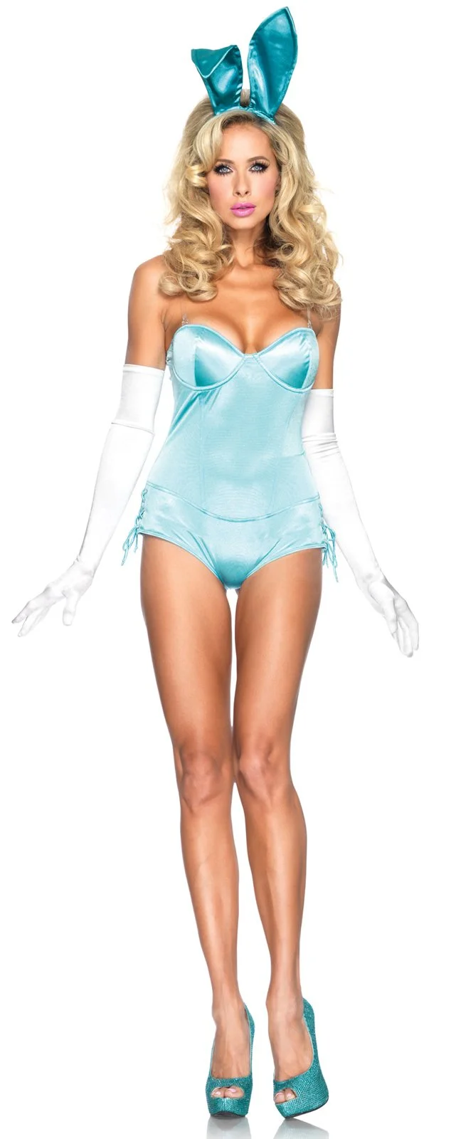 The Bunny Blue Adult Costume includes a satin teddy with detachable clear straps, removable tail and matching ear headband.