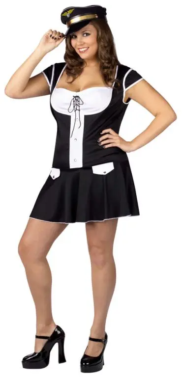 Costume includes: Drop waist mini dress with lace up bust, name tag and pilot hat.