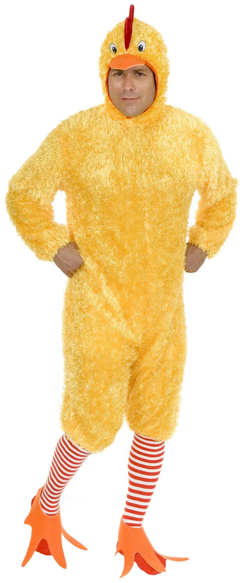 You can do the funky chicken all night long in this costume! It includes a comfy, fuzzy bright yellow microfiber jumpsuit, a matching hood with cheerful chicken face features. Orange and white striped stocking and chicken feet shoe covers complete this fun and crazy ensemble. Available in Adult Plus Size: 1X. Approximate Measurements: Chest 52″, Length 45″.Includes: Jumpsuit, Leggings, Headpiece, Shoe Covers. See our fabulous selection of chicken costumes to outfit the whole family for a hilarious group costume!