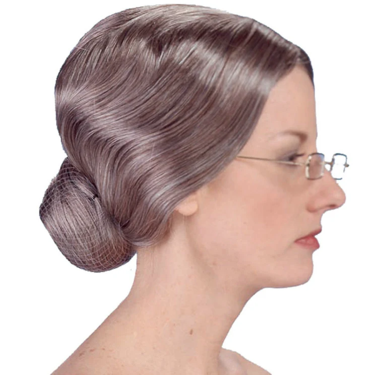 The Deluxe Old Lady Wig features silvery gray hair pulled tightly back into a bun at the nape of the neck. It is perfect for your granny or old-fashioned school marm costume (sold separately).