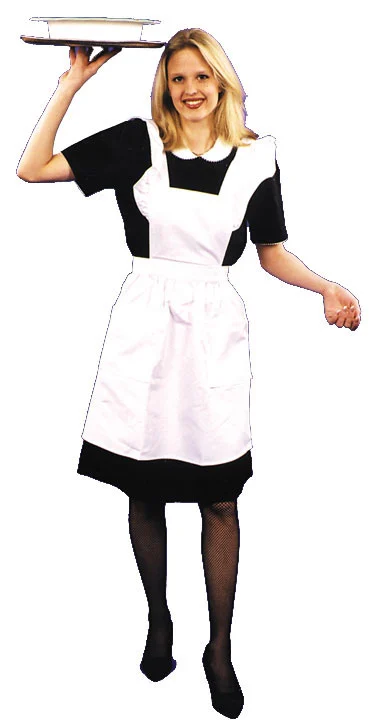 Costume includes: Solid black dress with white collar. 50’s style, made of poly-cotton with zip front. Available sizes:
