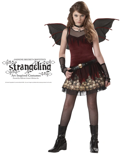 Inspired by the artwork of Jasmine Becket-Griffith, this Gothic fairy costume is perfect for girls who love their fashion just a little on the dark side. The Girl’s A Candle in the Dark Costume features a burgundy and black dress with creepy skulls on the skirt. A black belt includes a skull belt buckle. Black mesh glovlettes, a faux leather choker with a fairy charm, and a set of fairy wings complete a dark and sexy costume your girl will adore. The Goth fairy costume is available in sizes large and extra large, and will fit girls in sizes 10 to 14 comfortable. This is the ultimate in cool and sexy Halloween costumes and you won’t find this costume at a lower price in any retail store or internet web site. Be sure and check out the accessories section for boots to make this outfit perfect. * Features a dress, wings, belt, glovelettes, leggings and a choker with charm. Boots not included. * Fishnet stockings sold separately.