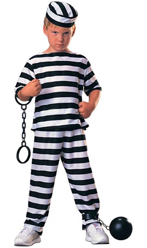 HatShirtPantsHe should’ve known better than to swipe the cookie from the cookie jar! Your child will have a blast dressing as a jail bird in this kids prisoner costume. The short sleeved shirt is covered with black and white stripes to mimic a classic jail uniform. The matching pants have an elastic waist for a comfortable fit. Top it off with the matching hat for a head to toe criminal appearance. All pieces are made of 100% polyester. Pair this costume with a ball and chain accessory for even more fun this Halloween!