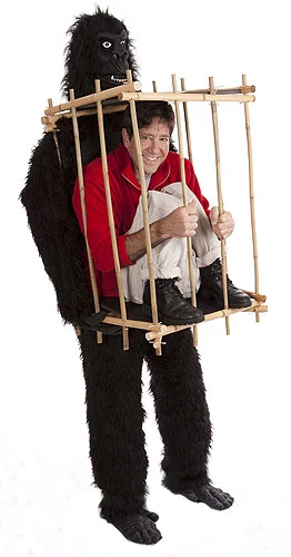 Gorilla Suit w/Head, Hands, and FeetCage PiecesEveryone will be doing a double take when you arrive in this man in gorilla cage costume! The funny costume includes a gorilla jumpsuit that is covered in black, faux fur. It velcros for closure and features attached gorilla hands. A gorilla mask and feet are also included as well as gorilla socks, which are also covered in faux fur. The package comes with gorilla “bones” to support the mask and for best results the gorilla’s mask, upper body and arms should be stuffed. A large opening at the waist allows you to stick out your body into the bamboo cage. The cage measures 26 1/2″ tall and is secured to the gorilla suit with pegs. The cage and entire costume requires assembly using the peg and hole system. A descriptive step-by-step instruction booklet with pictures is included. The costume is not recommend for persons over 6’5″ or over 240 lbs. Please note the costume does not include the person’s shirt, pants or boots. Let the roles be reversed this Halloween with this funny gorilla costume!