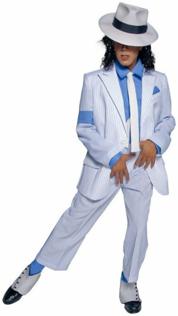 “You’ve been hit by; you’ve been struck be a smooth criminal!” Bring the king of pop to life this Halloween. This awesome ensemble includes a cool white pin striped jacket, matching trousers, a light blue shirt, a solid white tie, and a pair of spats. Sure to be a thrilling hit at your next costume party!