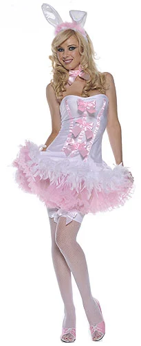 Strapless Chemise w/Chandelle Trimmed HemBunny EarsChokerShow off your flirtatious bunny style at your next Halloween or Easter party in this sexy costume! It consists of a white, strapless dress made from a nylon and spandex blend. Pink ribbon accents the torso including three bows. White marabou trim lines the bottom giving this bunny dress a fun and unique touch. A pair of white bunny ears are attached to a white headband for a comfortable fit. Pink highlights the headband and the wire lines the ears so they can be shaped to your liking. The costume is complete with the white choker that is embellished with a pink bow. Add our pink petticoat and white fishnet stockings and crank up the sex appeal!