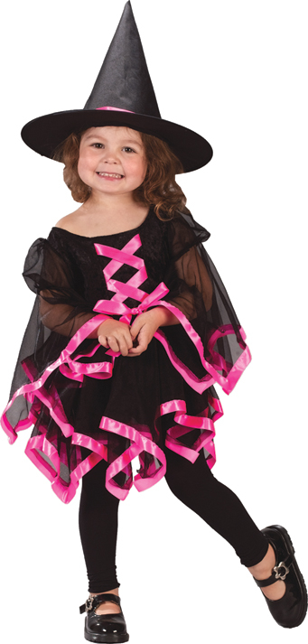 So Pretty In Pink!Costume includes: Dress with tie up look front, see through drop sleeves and traditional witch hat.Available size: