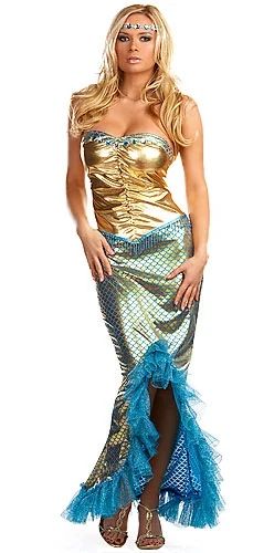 Gold Foil Shell Print GownCollapsible Plastic HemRhinestone HeadpieceRemovable Shoulder StrapsBecome an enchanting creature from the deep blue sea in our sexy mermaid costume! This gold strapless gown is made from polyester and has a tapered hem to suggest a tail design. Clear, removable shoulder straps are included for extra support. The gold bodice has blue and silver gemstones at the top with clear bead details in between each jewel. There is a strip of contrasting gold material with a blue scale print along the top bustline that matches the skirt. The bodice has a gathered ruffle in the center that runs down to the waist which is decorated with a blue ribbon trim and dangling rows of aqua blue beads in the front. The skirt, or “tail” portion, is shiny bronze with a light blue scale print. The tapered hem is trimmed with a shiny blue netting and is lined with a collapsible plastic tubing to maintain the perfect shape. Top off your exotic look with the included jeweled headband. The elastic band is gold with blue and silver gemstones and clear beads arranged in a design that matches the jewels on the dress. Be sure to check out all of our fun mermaid accessories to complete your look!