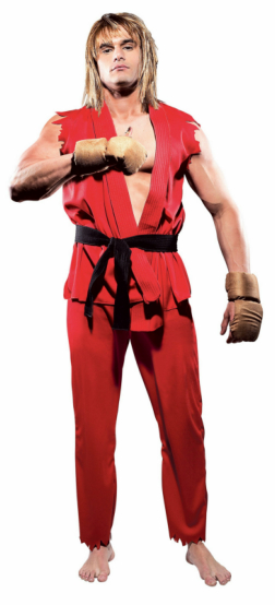 Get ready and fight Akuma through the blaze of glory! The Street Fighter Ken Adult Costume includes: A red wrap style martial arts top, red tethered pants, a black belt, and a pair of brown fighting gloves. You’ll be ready for an action packed Halloween with this macho ensemble.