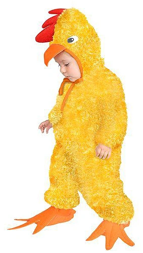 Micro Fiber JumpsuitHeadpieceFootiesYour toddler will be the envy of the farm in this chicken costume! The adorable costume includes a fuzzy yellow jumpsuit made from polyester. It ties behind the neck for easy on and off while orange trims the neckline. The matching chicken hood also ties under the chin and features a large opening for your child’s face. It includes a chicken beak, eyes and red comb for a cute look. The costume is complete with a pair of chicken feet booties. Claws are attached on top and the booties are secured in place with elastic. Perfect for clucking around this Halloween season!