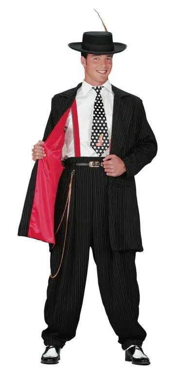 It’s A RiotIncludes: Black with gold pin striped oversized jacket, fully lined with red satin and cuffed pants with attached suspenders. Available Sizes: